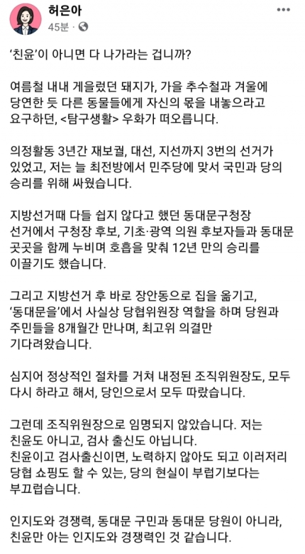 | Subject | 김경진, 동대문을 與당협 내정에…김웅 "조강특위가 허은아 내쳤다" |