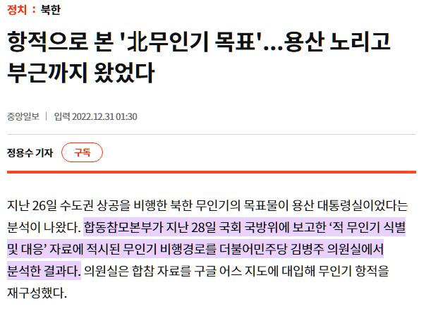 Subject   대통령실 "北 무인기 항적 3일 최종 확인... 野 정보 어디서 입수했나"