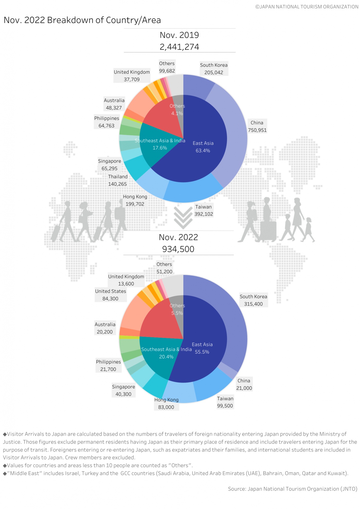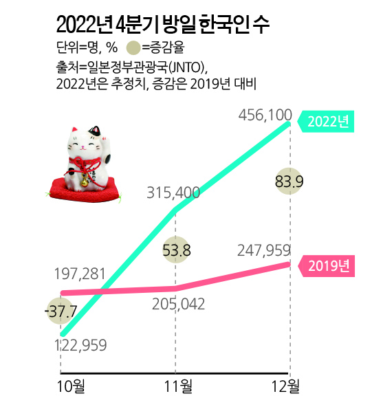 위는 11월인데, 12월 통계는 한국인이 전체 방일 외국인 137만 명 중 33%인 45만 6천여명이었습니다. 코로나19가 문제가 되기 이전인 2019년 12월에는 247,959명이었습니다. (당시는 No Japan 분위기가 강해서)