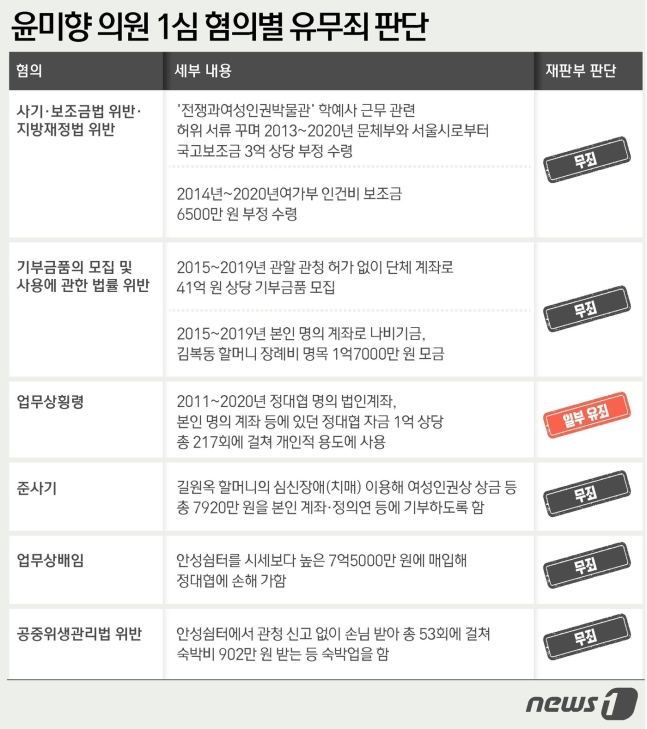 ///재판부는 이날 윤 의원의 혐의 대부분에 대해 무죄를 선고했다. 업무상횡령 혐의에 대해서만 일부 유죄 판단을 내렸다.