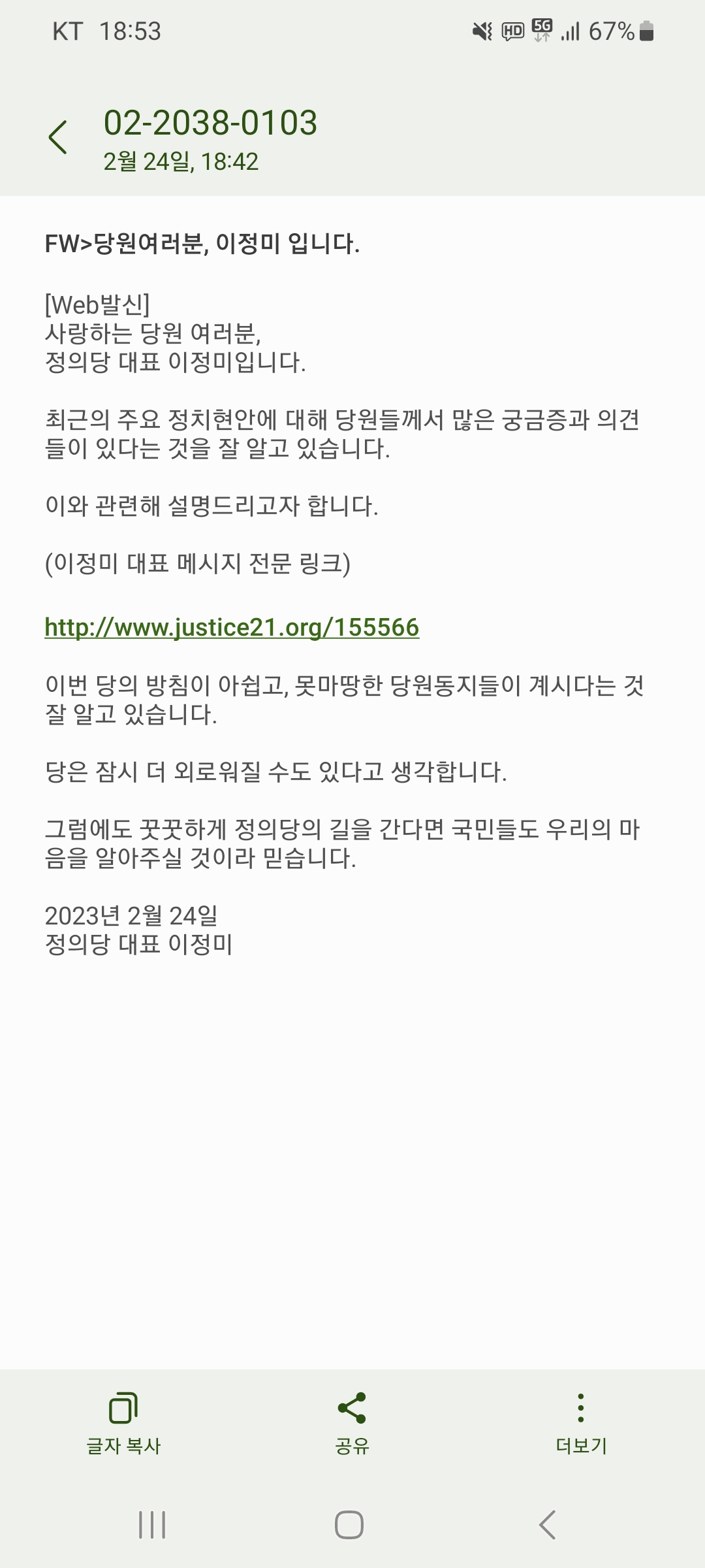 Subject   정의당, 전당원에 문자…“체포동의 찬성, 이재명 구속 찬성 아냐”