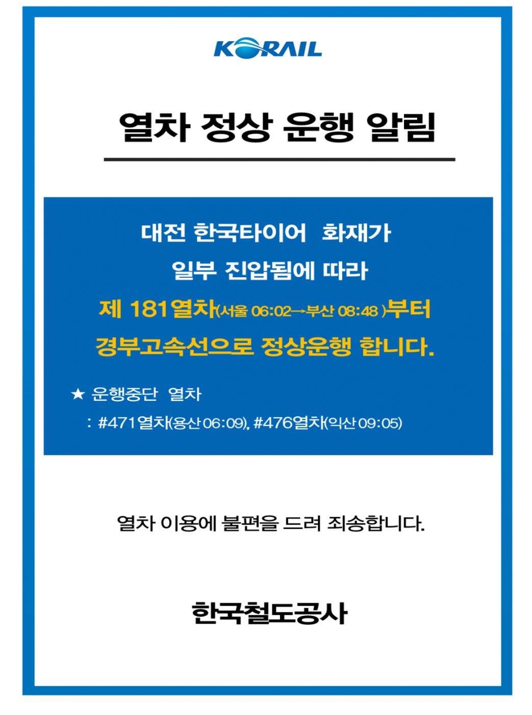 Subject   대전 한국타이어 화재로 경부고속도 통제·KTX 상하행선 지연