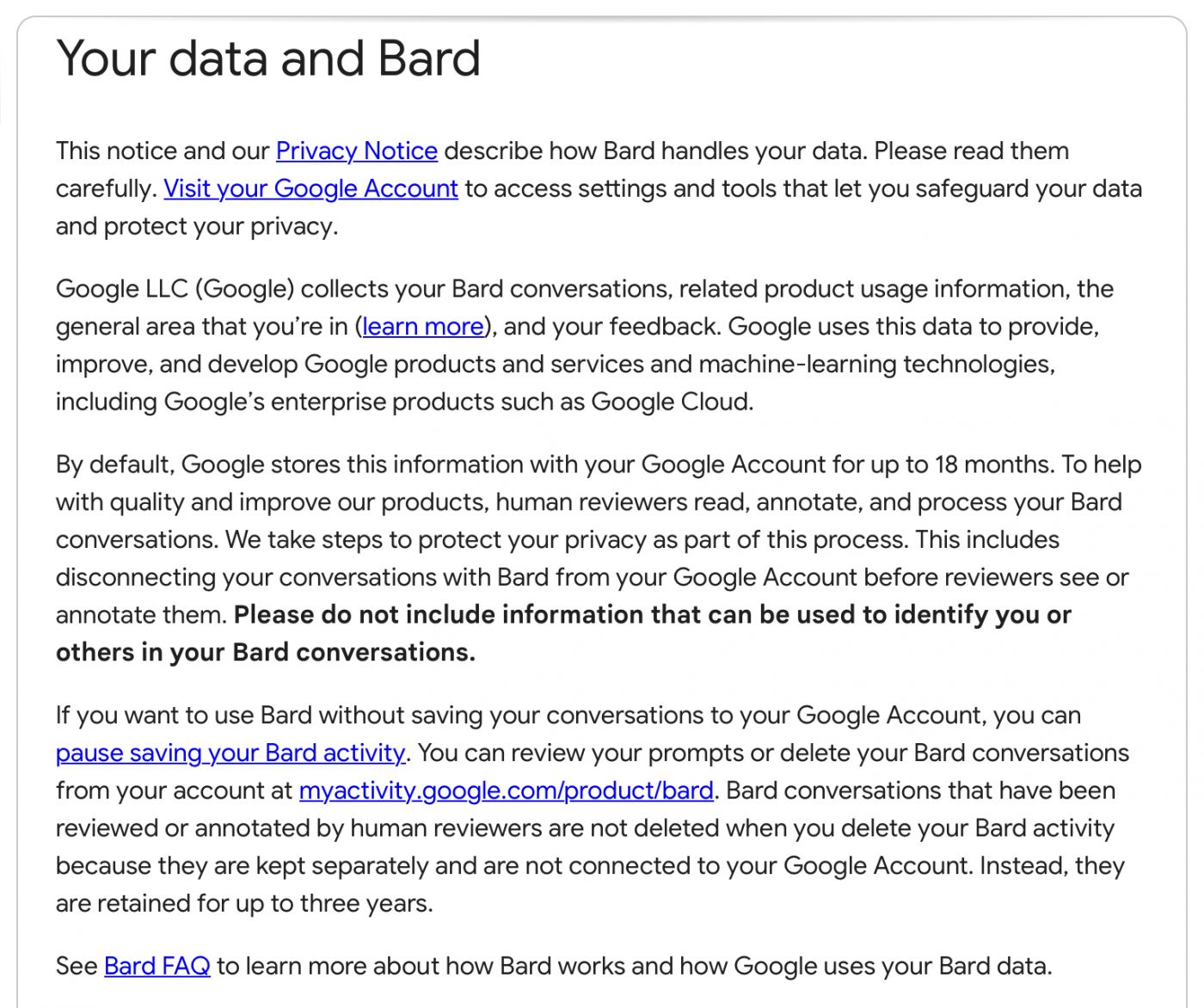 https://m.yna.co.kr/view/AKR20230419079200017 https://bard.google.com/ 일반인 대상 바드 한국 베타 서비스가 시작되었습니다. ChatGPT도 비슷한 주의 사항이 있지만, 구글 계정과 연동되고, 구글 직원들이 들여다보기 때문에 (계정 정보와 분리해서 사용한다고 하지만 위험성은 존재) 가능하면 개인이 일상적으로 쓰는 계정이나, 업무용으로 쓰던 계정으로 사용을 피하고, 사용 시에는 민감한 개인 정보나 업무 정보들은 언급하지 않는 것이 좋습니다. 1