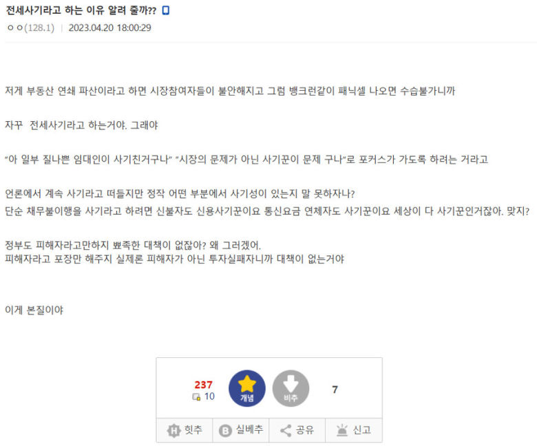 https://www.yna.co.kr/view/AKR20230421114952003 https://www.yna.co.kr/view/AKR20230421143000003 *좀 더 자세한 기사를 추가했습니다. 임차보증금을 (대신)선지급하는 것은 불가하고, 이미 있는 LH 매입임대주택 제도를 활용, 매입해서 피해자들이 거주할 수 있게 한다고 합니다. https://youtu.be/lVrs1pakxKI 0