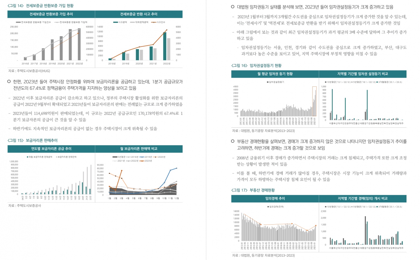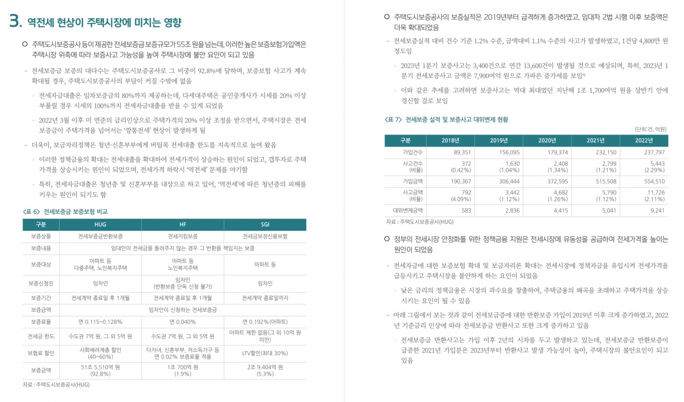 “전세보증금 미반환 사고는 보증보험 가입 이후 2년 시차를 두고 일어나는데 지난 2021년 가입한 보증보험은 올해부터 전세보증금 미반환 사고로 이어질 가능성이 높아 주택시장 내 불안요인으로 작용하고 있다.. 2020년부터 급격히 오르기 시작한 전세가격은 기준금리가 인상됐던 [2021년 8월까지] 지속적인 상승세를 보이다가 기준금리 인상 이후에나 조정됐다.. 이 기간 동안 저금리 환경과 임대차2법[2021년 7월 시행] 시행은 전세가격 폭등 원인으로 작용했다”