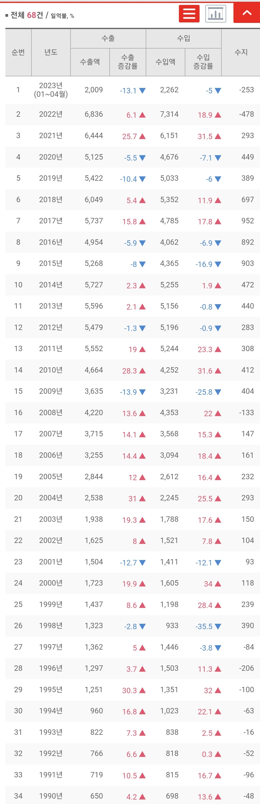 https://v.daum.net/v/20230601091240388 [1일 산업통상자원부가 발표한 '2023년 5월 수출입동향'에 따르면 지난 5월 우리나라 수출은 522억4000만달러, 수입은 543억4000만달러로, 무역수지는 21억달러 적자를 냈다. 수출은 전년 동월(616억달러)보다 15.2% 감소한 522억4000만달러를 기록했다. 계속되는 IT업황 부진, 지난해 5월 수출이 역대 5월 중 기준 2위 실적을 기록한 기저효과 등으로 감소세를 나타냈다. 다만 조업일수 영향을 배제한 일평균 수출은 지난해 10월 이후 처음으로 24억달러대를 회복했다.] 킹달러와 중국 수출 감소의 여파로 15개월 째 무역 적자가 지속되고 있습니다. 국내는 금리 인하로 경기를 부양하겠다는 정부의 의지가 보이는데, 무역적자 누적에도 그러한 처방이 유효할지는 걱정입니다. 당장 이쪽 업계에서도 상위권 제약사부터 구조조정 얘기가 나오고 있습니다. 0