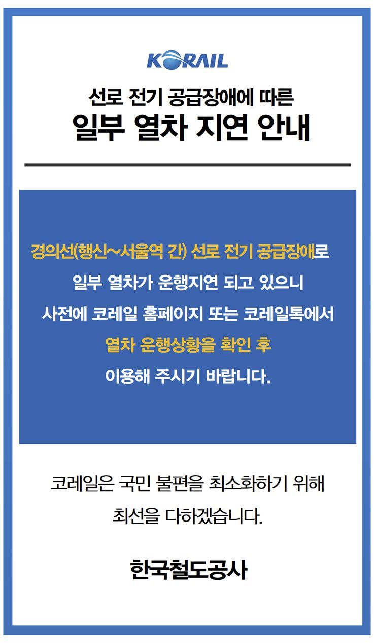 | Subject | 서울서 전기공급 장애로 경부·호남선 KTX 운행 지연 |