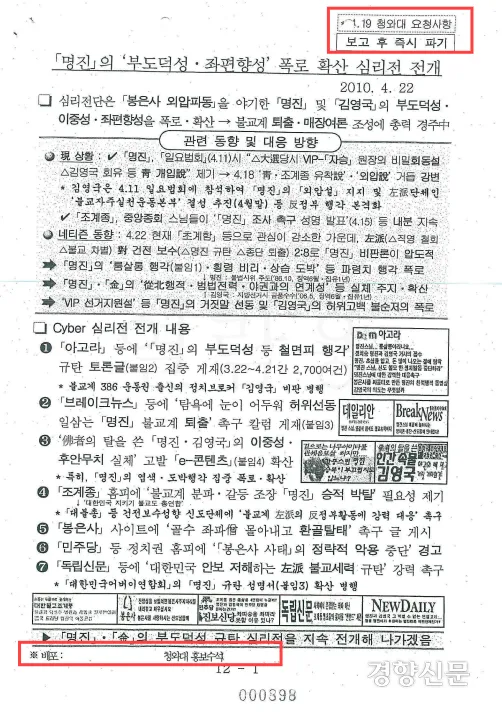 | Subject | 이동관 홍보수석실, 국정원에 정부 비판 인사 ‘여론 조작’ 지시 |