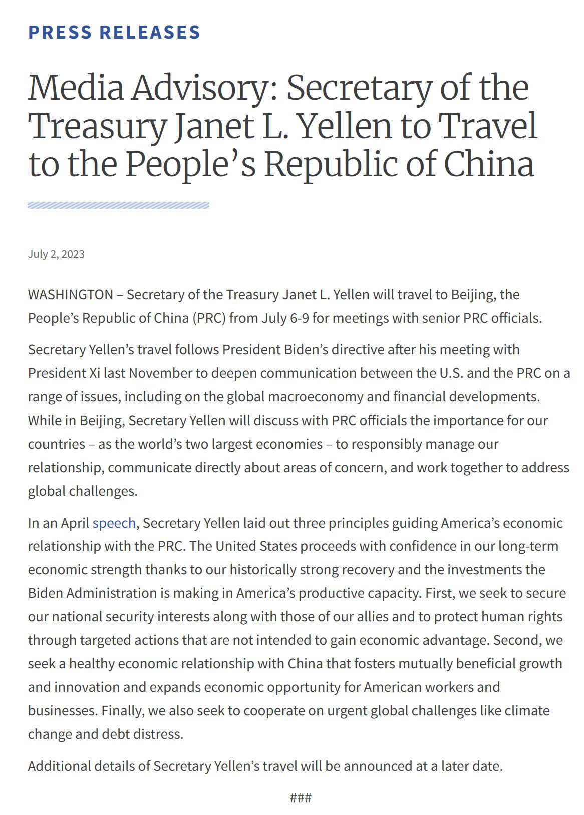 블링컨 국무장관에 이어 재닛 옐런 재무장관의 방중이 확정된 것 같습니다.