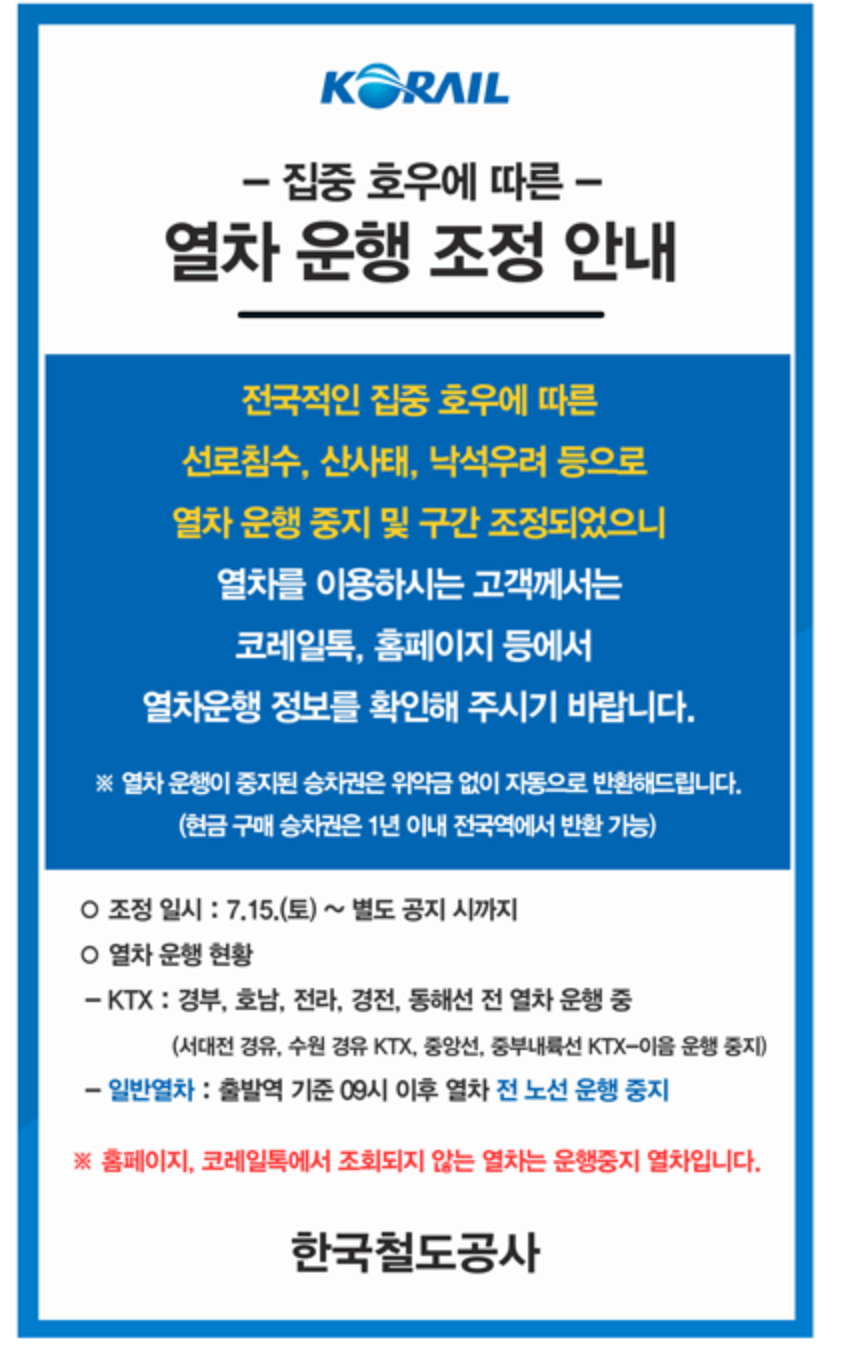 Subject   집중호우에 KTX 등 열차 운행 170여회 중지…30여회 조정