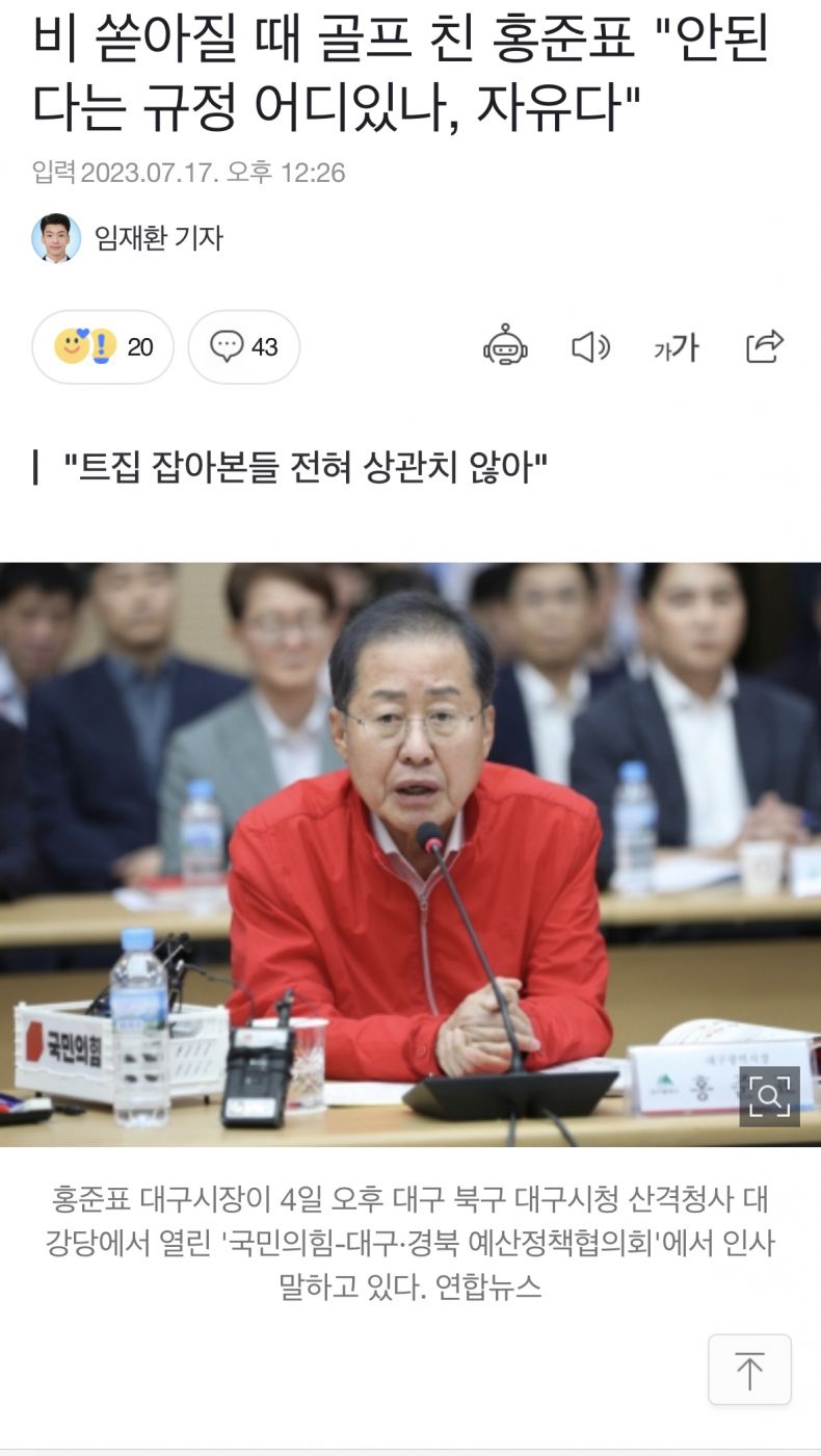 https://n.news.naver.com/mnews/article/001/0014072016 윤 대통령은 마지막으로 "이런 기상이변은 늘 일상화되는 것이기 때문에 늘 있는 것으로 알고 대처해야지, 이상 현상이니 어쩔 수 없다는 식의 인식은 완전히 뜯어고쳐야 한다"며 "비상한 각오로 임해달라"고 재차 당부했다. 윤 대통령은 이어진 회의에서도 "지금 제일 중요한 것은 인명 피해를 막고 최소화하는 것"이라며 "국민 안전을 담당하는 공무원들은 집중호우가 올 때 사무실에 앉아만 있지 말고 현장에 나가서 상황을 둘러보고 미리미리 대처하라"고 지시했다고 대통령실 이도운 대변인이 서면 브리핑에서 전했다. ---------- 자기 자신에게 하는 말인가요? 3