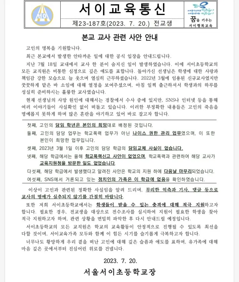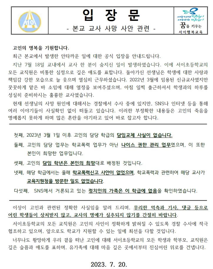https://naver.me/FsKNvuK8 극단적 선택을 한 서울 서초구 S초등학교 교사의 유족이 경찰에 "학부모 마찰 여부에 대해 수사해 달라"고 요청했다고 서울시교육청이 <오마이뉴스>에 밝혔다. 관련해 서울교사노조는 "고인은 1학년 담임 반 학부모 4명으로부터 지속적인 시달림을 당했다"고 설명했다. 지난해 3월에 이 학교에 첫 부임해 교직 2년차였던 고인은 지난 18일 오전 10시 50분 해당 학교에서 사망한 상태로 발견된 것으로 알려졌다. 앞서 서울교사노조는 지난 19일 낸 성명에서 "동료 교사에 따르면 지난주 고인이 맡았던 학급에서 학생끼리 사건이 있었다. 학생 A가 뒤에 앉아 있던 학생 B의 이마를 연필로 긁었다"면서 "학생 B의 학부모는 이 사건을 이유로 교무실에 찾아왔고, 고인에게 '교사 자격이 없다', '애들 케어를 어떻게 하는 거냐'라고 강하게 항의했다고 한다"고 밝혔다. 그러면서 서울교사노조는 "고인은 '학교생활이 어떠냐'는 동료 교사의 질문에 '그냥 작년보다 10배 정도 힘들어요'라고 답할 뿐이었다. 같은 학년 교사끼리 하소연하는 자리에서도 고인은 침묵을 지켰다"고 상황을 전했다. 다시는 이런일이 없었으면 좋겠습니다. 0