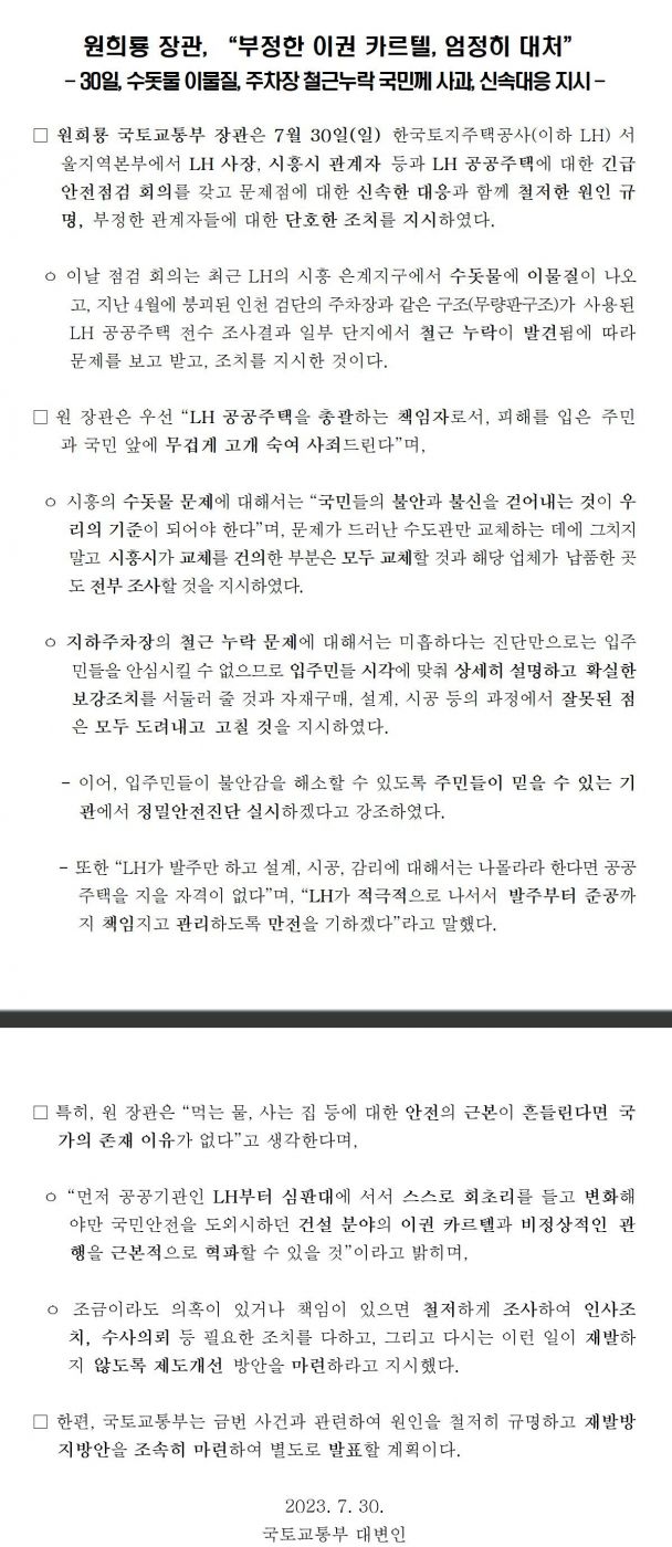 https://www.yna.co.kr/view/AKR20230730032351003 역시나?! 순살이 대세였나? 지하주차장 외에 다른 문제들도 전수조사하면 어떻게 될지 궁금합니다. 무량판구조 민간 발주 아파트단지 조사 결과는 8월 중 발표 예정입니다. 다른 아파트들도 전면 재시공 해주지는 않을 것 같군요? 국토교통부 보도자료 제목이... 원희룡 장관, “부정한 이권 카르텔, 엄정히 대처” http://www.molit.go.kr/USR/NEWS/m_71/dtl.jsp?lcmspage=1&id=95088647 0