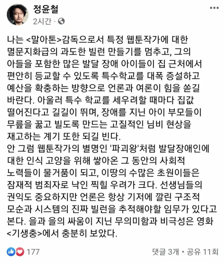 Subject   주호민, 두 번째 입장문 "선처 구하는 탄원서 제출..모든 특수교사들께 사과"