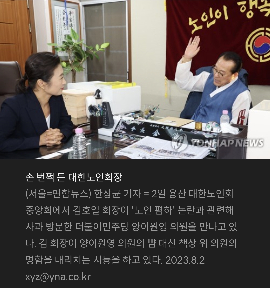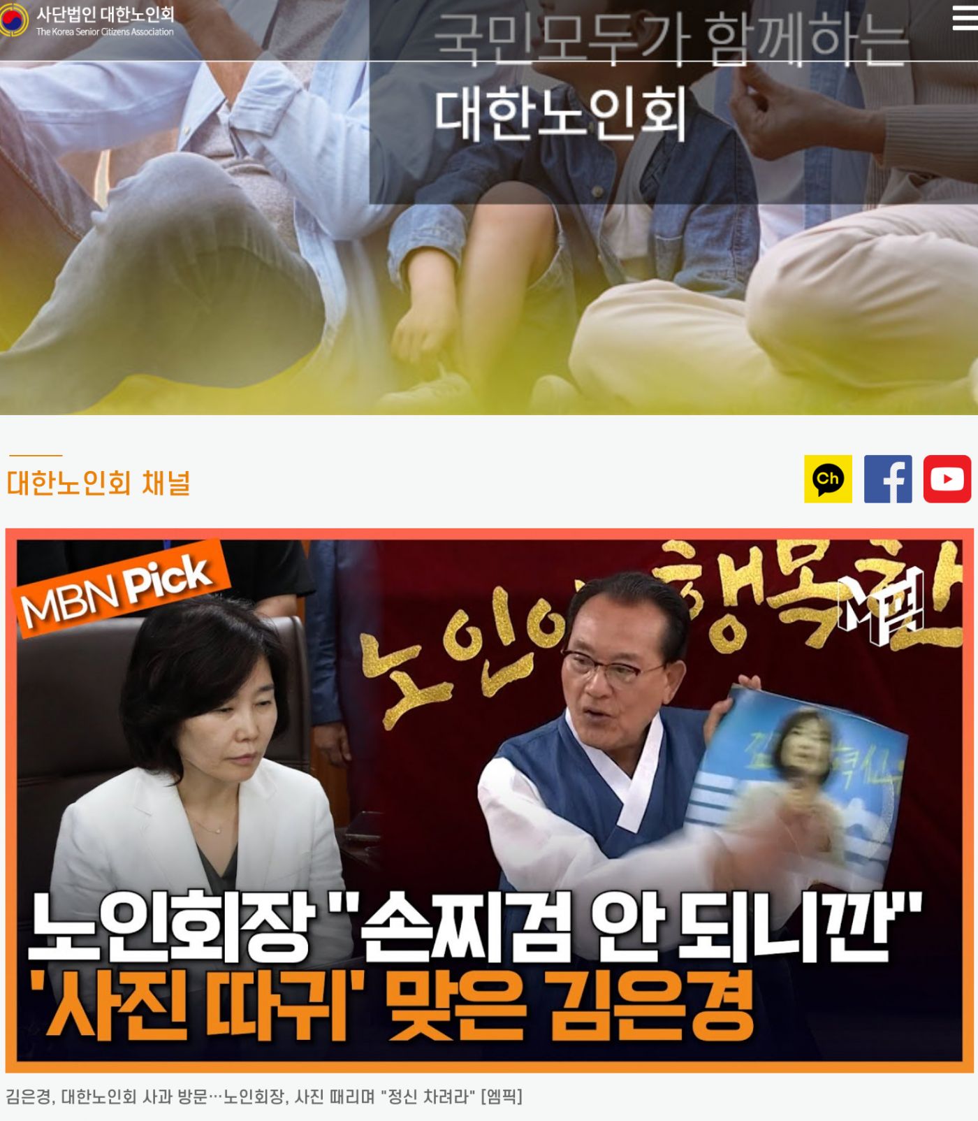 [김 회장은 “1000만 노인을 대표해 본인을 보고 볼을 때려야 노인들이 분이 풀릴 것 같은데 손찌검을 해서는 안 되니까 사진이라도 때리겠다”며 김 위원장의 사진을 들고 “정신 차려”라며 수차례 때리기도 했다.]