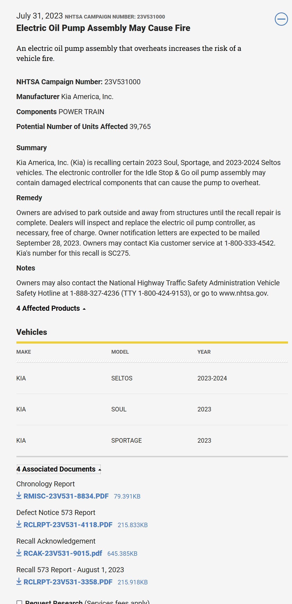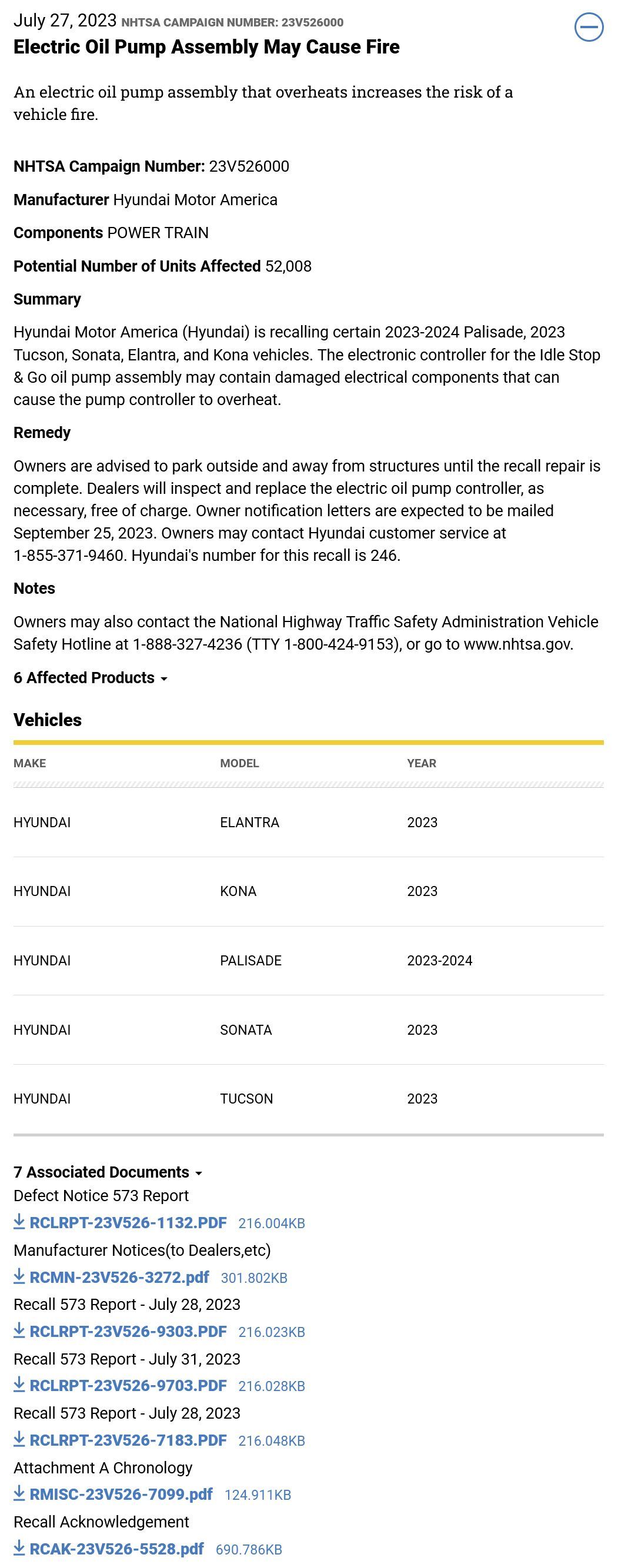 현대, 기아의 2023-2024 펠리세이드, 2023 투산, 소나타, 엘란트라, 코나, 2023-2024 셀토스, 20023 소울, 스포티지 차량은 화재 위험이 있어 집 밖이나 구조물에서 떨어진 곳에 주차하라고 합니다.