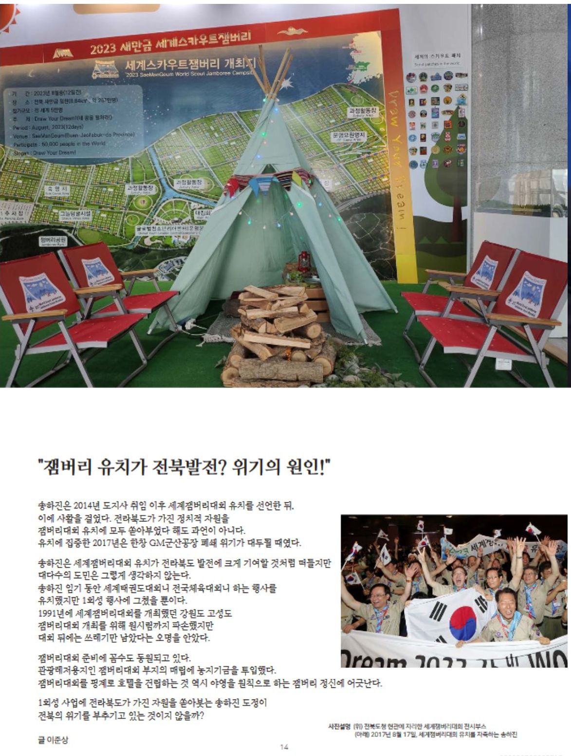 https://www.yna.co.kr/view/AKR20230805008752055 https://www.yna.co.kr/view/AKR20230805013800055 https://www.yna.co.kr/view/AKR20230805019800055 ==== ⌈루 폴슨(Lou Paulsen) 미국 보이스카우트 운영위원장은 5일 연합뉴스에 "우리는 날씨 때문에 떠난다"라며 "우리는 (평택 미군기지 내) 캠프 험프리스로 돌아가는 것으로 돼 있다"라고 말했다. 그는 "6일로 예정된 K팝 콘서트를 포함해 잼버리 활동을 관두는 것에 대해 대원들이 아쉬워하는 건 사실"이라면서도 "(문제의) 핵심은 날씨인데, 우리가 이제까지 겪은 일과 예상되는 날씨, 캠프장의 역량을 고려했을 때 청소년들을 제대로 돌보기 위해 내린 결정"이라고 말했다.⌋ ==== ⌈그런데도 대회 조직위원회의 대처는 안일하기 짝이 없었다. 위생 상태가 불량한 화장실과 탈의실 등을 한동안 내버려 뒀고, 폭염과 벌레는 '스카우트 정신'을 언급하며 극복할 수 있는 문제라고 강조했다. 여러 정부 부처와 기관으로 구성된 조직위의 소통도 원활하지 않았던 것으로 파악됐다. 언론 보도를 통해 숱한 문제점이 제기됐는데도 뚜렷한 개선책을 내놓는 대신, 타 부처나 기관에 책임을 떠넘기기 급급했다. 이번 대회는 김현숙 여성가족부 장관과 이상민 행정안전부 장관, 박보균 문화체육관광부 장관, 강태선 한국스카우트연맹 총재, 김윤덕 더불어민주당 국회의원이 공동 조직위원장을 맡고, 김관영 전북도지사가 집행위원장을 담당했다.⌋ ==== 주요국들이 나가면서 시쳇말로 나가리 되는 것 같군요. 이제 비난이 어디로 향할지 궁금하군요. 무리하게 새만금 선정을 강행한 전 전북지사 등(카르텔?)에게 향하는 비난도 있을 것이고, 일단 정해진 이후에 코로나19 등이 있었다고 하더라도 건물이나 시설을 비롯해 예상된 폭염 대비를 제대로 못 한 쪽도 있고, 운영이나 대응 자체가 엉망이었던 의사결정권자들도 있었던 것 같고. ==== 계속 진행한다고 합니다. https://www.yna.co.kr/view/AKR20230805035052001 https://www.yna.co.kr/view/AKR20230805039100055 https://www.yna.co.kr/view/AKR20230805023700055 1