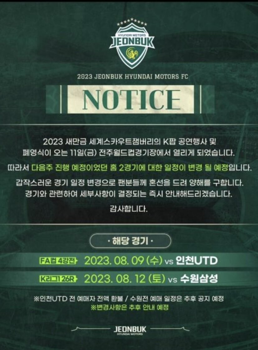 속보]잼버리 K팝콘서트, 11일 전주월드컵경기장…프로축구는 장소이동