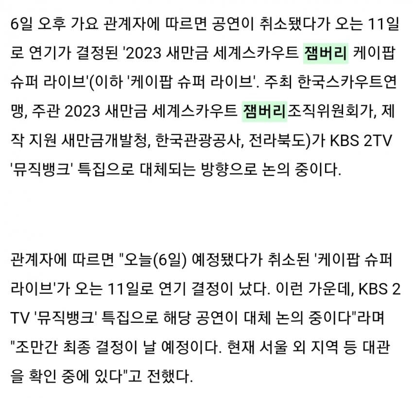 Subject   잼버리 K팝 콘서트 11일 전주서 개최+기사 짜집기 추가