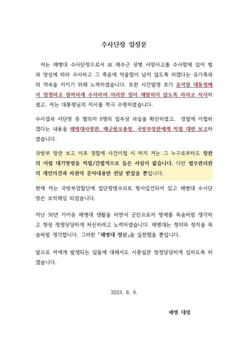 | Subject | 해병 수사단장 입장문 "윤 대통령 지시 따라 수사…수뇌부 대면보고" |