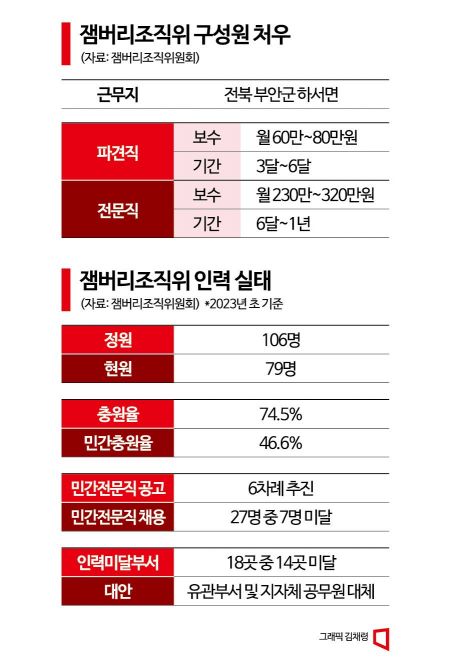 잼버리조직위에 인력충원이 원활하지 않았던 배경에는 열악한 처우가 있다. 잼버리조직위에 소속되면 전북 부안군 하서면에서 근무를 시작해야 한다. 민간전문가도 월급은 최저 230만원에 불과하다. 파견직의 경우 보수가 월 60만~80만원으로 더 낮다. 근무 기간도 길어야 1년이고 짧으면 3개월 만에 끝난다. 최대 900만원에 달하는 월급이 책정된 임원들이나 1000만원이 넘는 명절휴가비를 받은 조직위 사무총장과 비교하면 민간부문 처우가 지나치게 열악했다는 평가가 나오는 이유다.