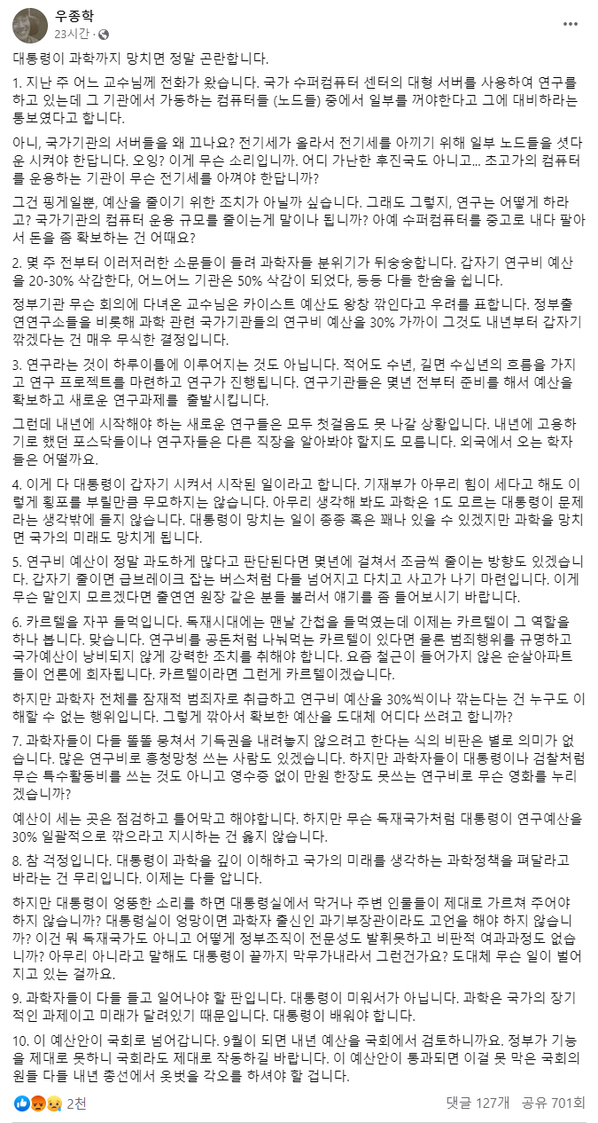 --------------------------------------------------------------------------- 어제 우종학 교수 페북 글을 캡쳐된 것으로 보았는데, 오늘 관련 기사가 올라왔군요. 과학 관련 예산 삭감의 여파가 곧바로 나타나는 것 같습니다. 1