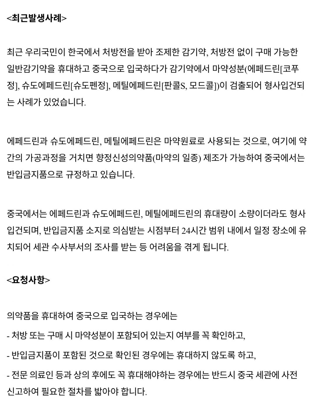 | Subject | 中입국시 韓감기약 '금지성분' 적발 잇따라…"성분 확인해야" |