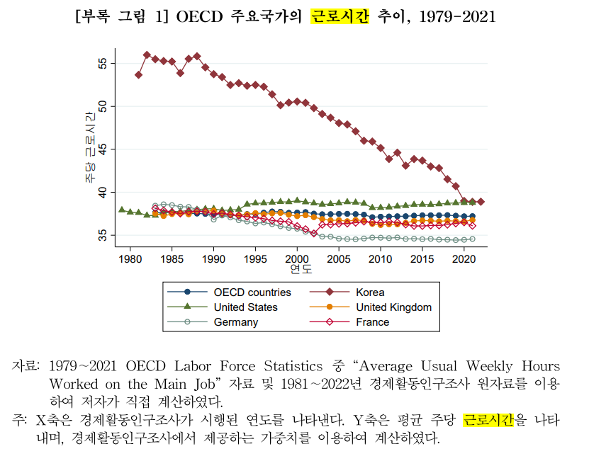 ![]() 11일 한국경영자총협회가 발표한 '근로시간 현황 및 추이 국제비교 분석' 보고서에 따르면 한국 임금근로자들의 연평균 실제 근로시간은 지난 20여년간 500시간 이상 감소, OECD 국가 중 감소 폭이 가장 큰 것으로 나타났다. 한국의 전체 임금근로자 1인당 연간 실근로시간은 21년 전인 2001년 2458시간이었으나 지난해에는 1904시간으로 554시간 짧아졌다. 같은 기간 OECD 평균 실근로시간은 1767시간에서 1719시간으로 줄면서, 한국과의 격차는 691시간에서 185시간으로 감소했다. 주당 40시간 근무를 기준으로, 과거 21년 전에는 17주 이상 격차가 났다면, 현재는 약 4주 남짓이 된 것이다. 2011년 통계 원자료상 단절이 있었던 점을 감안해 통계 연속성이 확보된 2011∼2022년을 기준으로 봤을 때도, 한국의 실근로시간은 2119시간에서 1904시간으로 215시간 단축돼 해당 기간 OECD 평균(1739시간→1719시간)과의 격차가 380시간에서 185시간으로 줄었다. 한국의 연간 실근로시간 감소 폭은 OECD 국가 중 가장 컸고, 2011∼2022년 기준으로 OECD 평균 감소 폭(20시간)의 10.8배였다. 그 결과 2001년에는 한국 풀타임 근로자의 주당 평균 실근로시간이 50.8시간, OECD 평균은 40.9시간으로 격차가 9.9시간이었으나 지난해에는 한국 42.0시간, OECD 평균은 40.7시간으로 격차가 1.3시간으로 감소한 것으로 분석됐다. 주요 7개국(G7) 중 OECD에 관련 통계가 없는 캐나다·일본을 제외하고 5개국(프랑스·이탈리아·독일·영국·미국)과 한국의 주당 평균 실근로시간 증감률을 비교해도 한국이 2001∼2022년 17.3% 감소하는 동안 프랑스는 0.9% 늘었고, 나머지 4개국은 0.6~4.6% 줄어드는 데 그쳤다고 경총은 설명했다. 하상우 경총 경제본부장은 "우리나라는 여러 요인을 고려하면 이제 근로시간이 OECD 평균과 비교해도 과도하게 길다고 볼 수 없는 수준에 도달했다"며 "저성장 극복을 위해서는 이제 장시간 근로국가라는 프레임에서 벗어나 근로시간 유연화 등 생산성 제고를 위한 제도 개선을 적극 도모해야 한다"고 말했다. 장시간 근로 프레임에서 벗어나야 한다는 주장이다. (중략) ============================================================================= 예전에 노동시간 단축 정책은 기업계가 산업경쟁력 하락을 핑계로 반발했는데 이제는 "한국 노동시간 그렇게 안 긴데?" 핑계가 나오는군요. 이것도 사회 발전의 결과입니다. 경총의 프레임을 무비판적으로 받아들일 이유는 없지만 출처가 객관적인 OECD 자료이기도 하고, 한국이 지난 20여년간 노동시간이 크게 감소하면서 타 선진국과의 노동시간 격차가 급격하게 줄었다는 건 사실 같습니다? 제가 올린 다른 뉴게글(https://www.redtea.kr/news/32237)도, 박진성(2023) 논문도 비슷한 결론을 도출합니다 물론 포괄임금제 등에 기인한 통계 밖 노동시간 변수는 있지만, 통계 밖 노동시간이 최근 크게 늘었을 개연성은 낮다고 봅니다. 노동시간 급감으로 선진국과의 격차가 빠르게 줄었다는 팩트는 바뀌지 않을 듯. + (추가) 한국 노동시간의 급격한 변화를 한눈에 보기 위해 박진성(2023)을 인용하자면 ![]() 과거의 아득히 긴 한국의 노동시간이 이제는 평범한 선진국 범주까지 너프됨.. 1