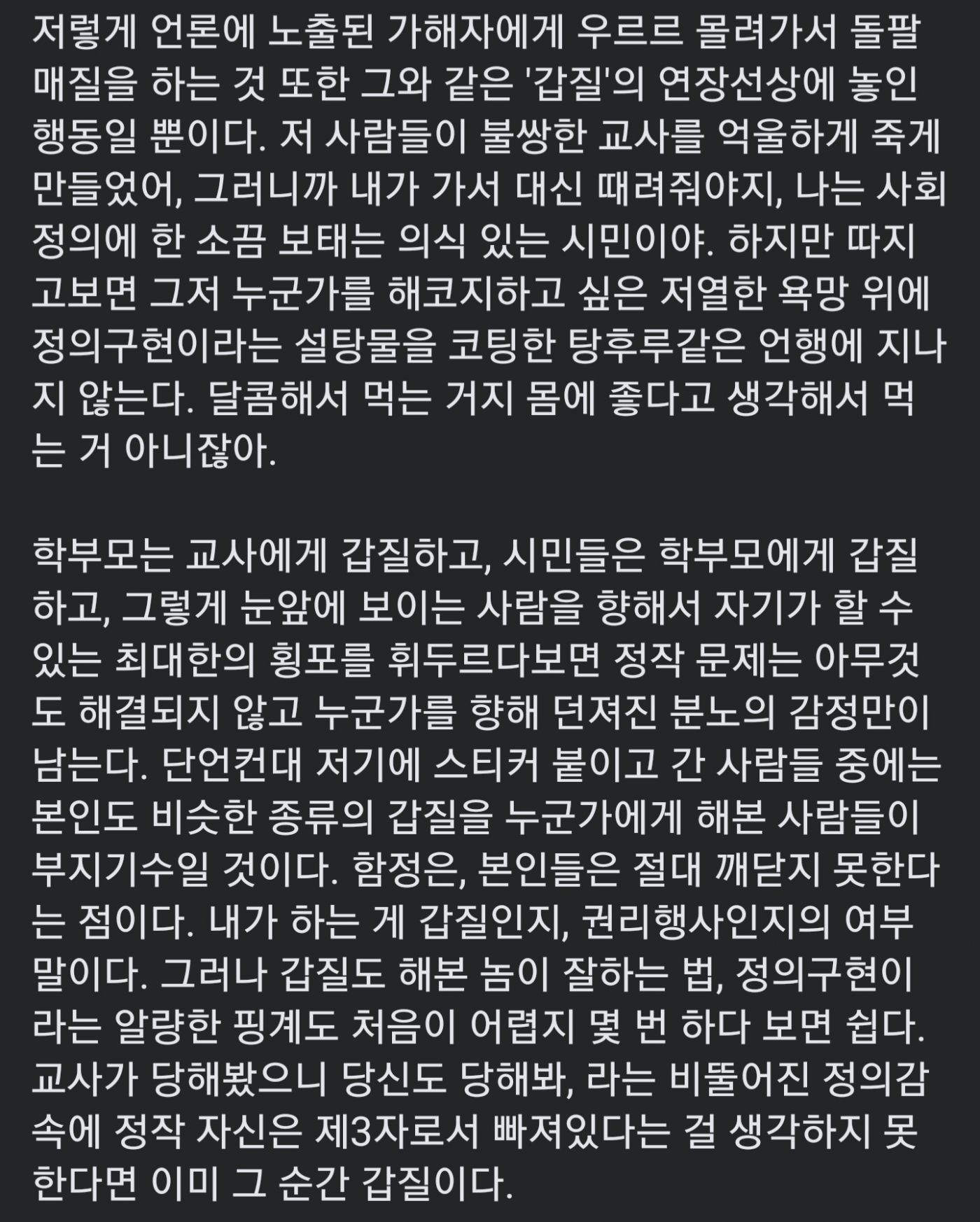 https://n.news.naver.com/article/469/0000760204?cds=news_my https://n.news.naver.com/article/014/0005071637?cds=news_my 잘못한 사람은 당연히 처벌을 받아야겠지만 그렇다고 마녀사냥을 당할 이유는 없지요. 더군다나 엉뚱한 사람에게 달려들어 돌을 던져대는건 참… 1
