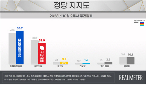 집권 국민의힘 지지율 32.0%로 尹정부 출범 후 최저치 https://m.ekn.kr/view.php?key=20231015010003397 민주당 50.7%로 尹정부 들어 첫 50%대 돌파 ===================================== 리얼미터 기준, 민주당 지지율이 드디어 과반을 돌파했습니다. 저야 매주 여조를 꽤 관심있게 보긴 합니다만 사실 뭐 요 몇달간 리얼미터 결과는 1대통령 지지율은 35 근방 2대통령 부정평가가 55 3민주당 조금 과반에 못미침 4국힘지지율과 대통령지지율 거의 같음 정도로 요약가능해서 딱히 관심가질 지점이 별로 없었읍니다만 이번주는 3이 깨지는 결과가 나와서 흥미롭게 볼 지점이 있는것 같읍니다. 아마도 강서구청장 결과가 영향을 미친듯 한데 이와중에 대통령 지지율이 집권이래 최저치이긴 합니다만 그래도 생각보다는 영향을 덜 받은것 처럼 보인다는 것도 인상깊군요. 제가 맨날 이재명이 당대표로서 별로라고 해왔던 이유중 하나가 차라리 우상호가 비대위원장 하던 시절이 지지율상 더 낫지 않았냐는 것이었는데 이번 결과로 인해 저도 뭔가 이제는 별로 할말이 없어지게 되었읍니다. 0
