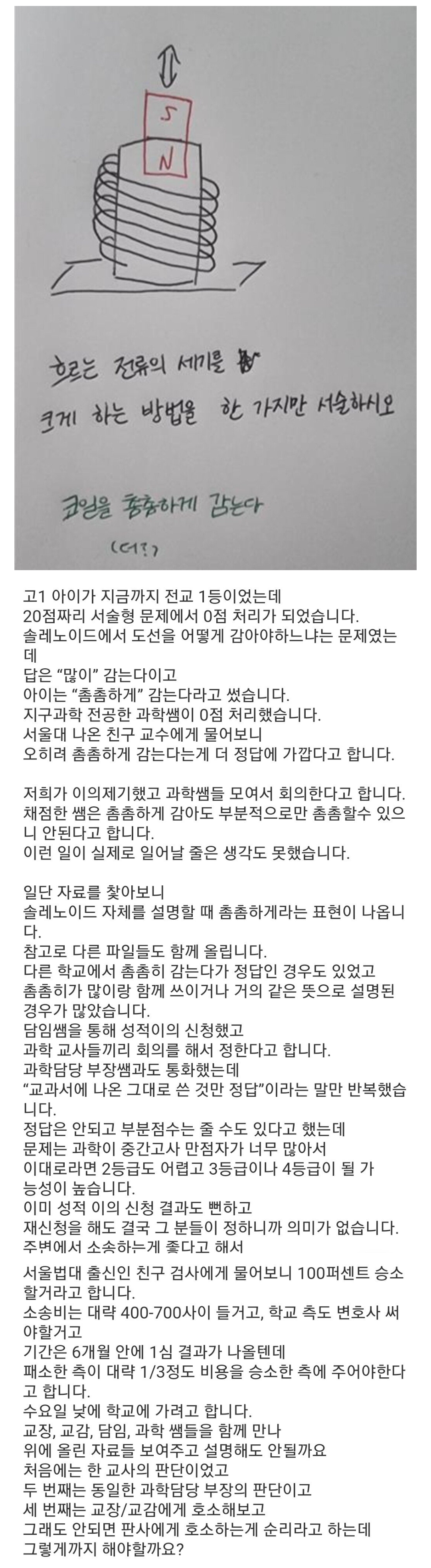 “전교 1등이 0점”… 오답? 채점 갑질? 온라인 달군 이 문제 https://www.chosun.com/national/national_general/2023/11/01/5TO7WGZKXRBJJEGDGMP7GAJN3Q/ 요문제가 아마 어제 정도에 대규모 커뮤니티들을 휩쓸고 지나갔다는것 같은데 킹차넷에는 탐라에만 잠시 언급되고 지나갔던것 같고? ㅋㅋ '내아들이 전교1등인데 0점 받았다'라고 글을 올렸던 원글 게시자는 글삭튀했다고 하는것 같고 제 생각에도 촘촘히는 오답이 맞는것 같습니다. 일단 정리를 좀 해보자면 ε = -N * A * dB/dt 이게 유도전력을 구하는 공식이고 N은 감은 횟수 A는 솔레노이드의 단면적 dB/dt는 시간당 자속의 변화를 의미합니다. 이 공식 어디에도 유도전력이 솔레노이드에 감긴 전선의 밀도에 영향을 받는다는 부분은 없습니다. 따라서 답은 [많이 감는다]는 확정적인 정답이되며 [촘촘히 감는다]는 확정적으로 오답이어야만 합니다. 원글 게시자가 왜 착각했는지 + 그리고 원글게시자가 '서울대 나온 친구 교수에게 물어봤더니 촘촘이 감는게 정답에 가깝다고 했다'라는 소리가 왜 나왔을지를 추정해보면 솔레노이드에 전력을 흘려넣었을때 유도되는 자기력의 세기를 구하는 공식이 아래와 같이 생겼는데 B = μ₀ * (N/L) * I μ₀은 진공의 투자율이라고 불리는 물리 상수이고 N은 감은 횟수 L은 솔레노이드의 길이 I는 솔레노이드에 가해진 전류의 세기를 나타냅니다. 그리고 자기력의 세기는 [많이 감을때]에도 커지고(N이 커질수록 비례해서 커짐) [촘촘히 감을때]도 커집니다. (N/L이 커질수록 비례해서 커짐) 저 글에 등장하는 서울대 나온 친구 교수라는 사람이 어쩌면 이부분을 제대로 전달 받지 못했을수도 있지 않나 싶읍니다. 원본 게시물을 유심히 보시면 게시자는 '자기력의 크기를 묻는 질문'과 '유도전력의 크기를 묻는 질문'을 제대로 구분하지 못하는것 같지 않나 싶은 생각이 들기도 하고요 ㅋㅋ 1