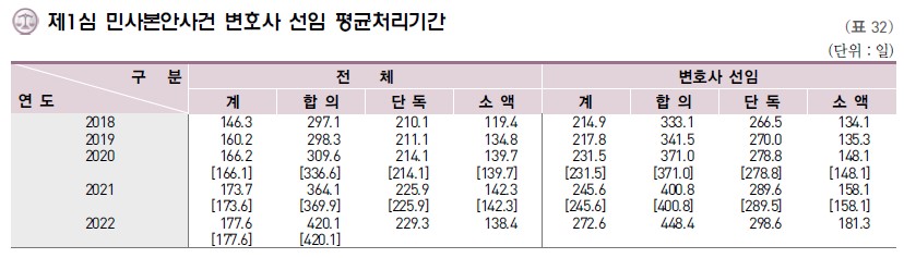 법조계 분들은 많이 이야기하는데, 근래 한국의 민사소송 처리기간이 많이 길어져서 문제가 되고 있습니다.