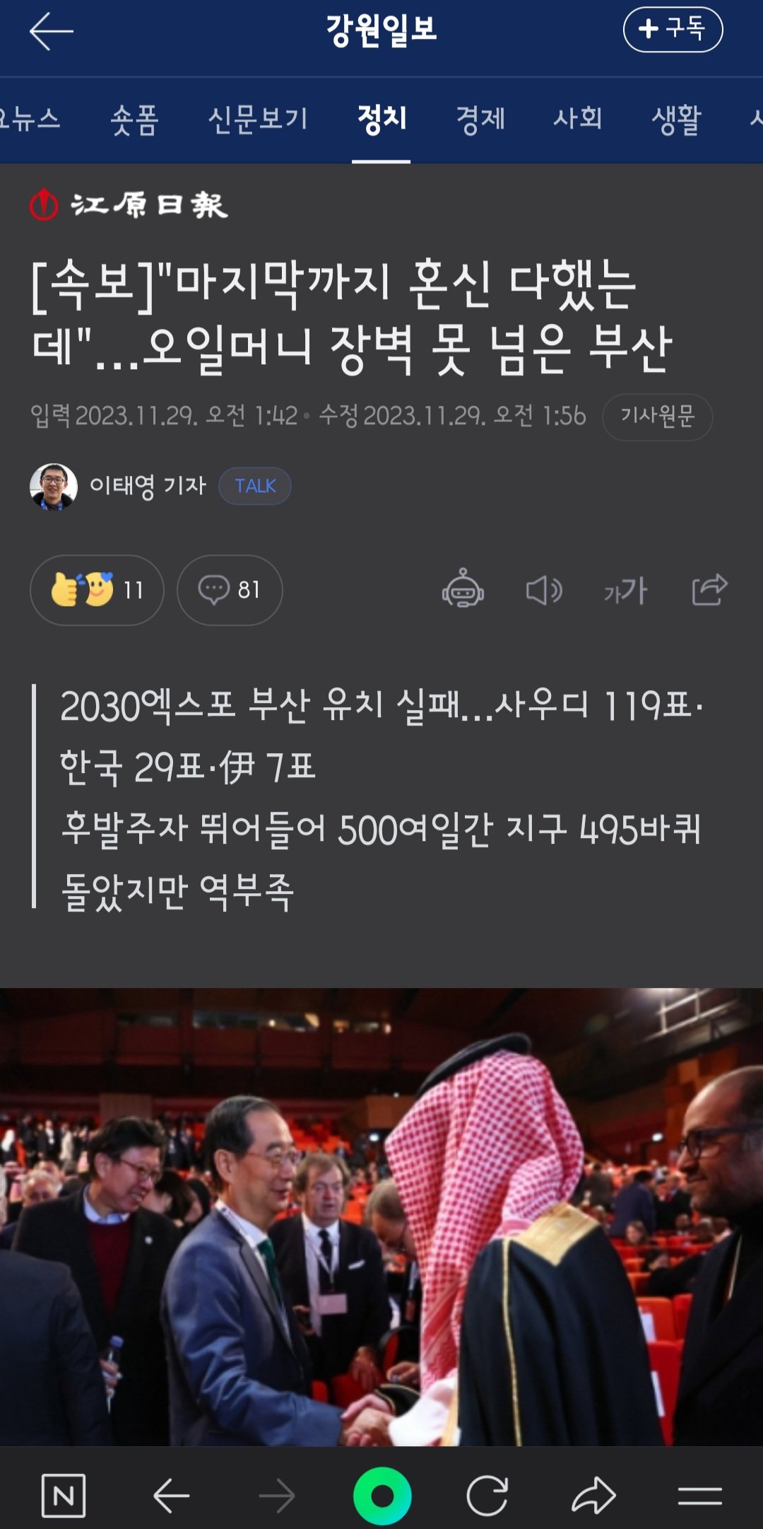 Subject   엑스포, 사우디 오일머니 벽 못넘었다… 부산 유치 실패
