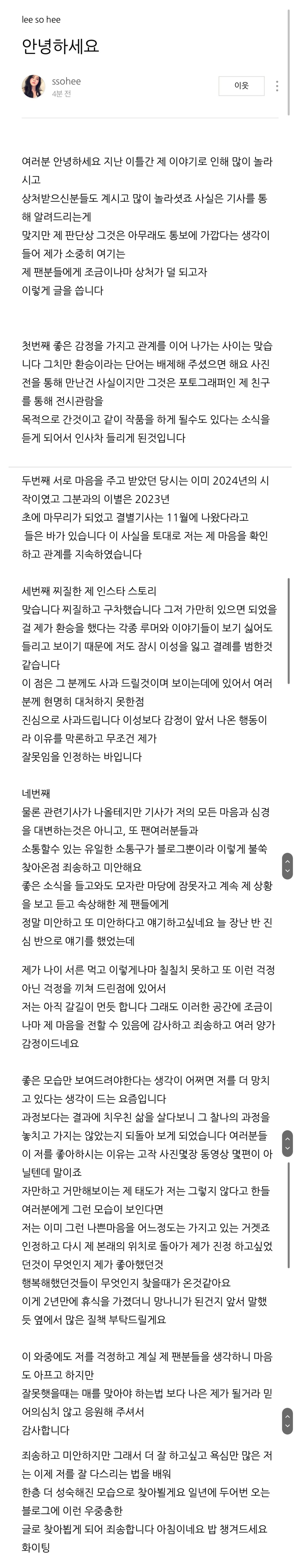 https://n.news.naver.com/entertain/article/076/0004121454 류준열이 올 초부터 한소희와 좋은 마음을 확인하고 만남을 가지고 있습니다. 류준열은 결별 이후 한소희를 알게 되었고 최근 마음을 확인한 것입니다. 여행지에서 양해 없는 촬영과 목격담에 공식적인 확인보다는 사생활 존중을 부탁드린 것인데, 열애 인정을 하지 않자 어제 오늘 불필요한 오해와 억측 등이 난무하여 배우의 인격권이 심각하게 침해당하고 있으므로 다시 한번 간곡하게 부탁드리고자 합니다. 앞으로도 당사는 배우의 최소한의 인격권 보호를 위해 개인적인 사생활을 낱낱이 밝히고 증명하라는 요청에는 일일이 입장을 드리지 않을 것입니다. 양해 부탁드립니다. 그렇다고 합니다. 누구든 빨리 결혼해서 애 셋 정도는 낳기를... 0