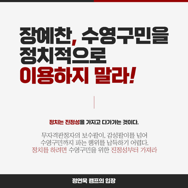 “장예찬, 수영구민을 정치적으로 이용하지 말라”며 “정치는 진정성을 가지고 다가가는 것”이라고 밝혔다.
