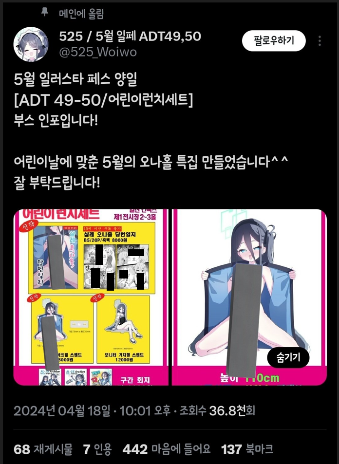 https://www.chosun.com/national/national_general/2024/05/06/UP3JP5NXNNFE5GONBJCCLKE66A/ 어린이날인 5일 경기 고양시 킨텍스에서 열린 한 페스티벌에 아동 음란물이 전시됐다는 신고가 접수돼 경찰이 출동했다. 문제의 전시물을 선보인 부스의 이름이 ‘어린이 런치세트’여서 논란은 더욱 커지고 있다. ====================== [어린이날]에 오타쿠 행사 성인용 부스들이 큰 이슈였습니다. 실제 부스들 사진이 트위터를 통해 돌아다니고 있는데 미성년자 캐릭터들에 대해 선 넘은 수위로 다룬 굿즈, 등신대, 상품들이 난립한 것으로 보입니다. 0