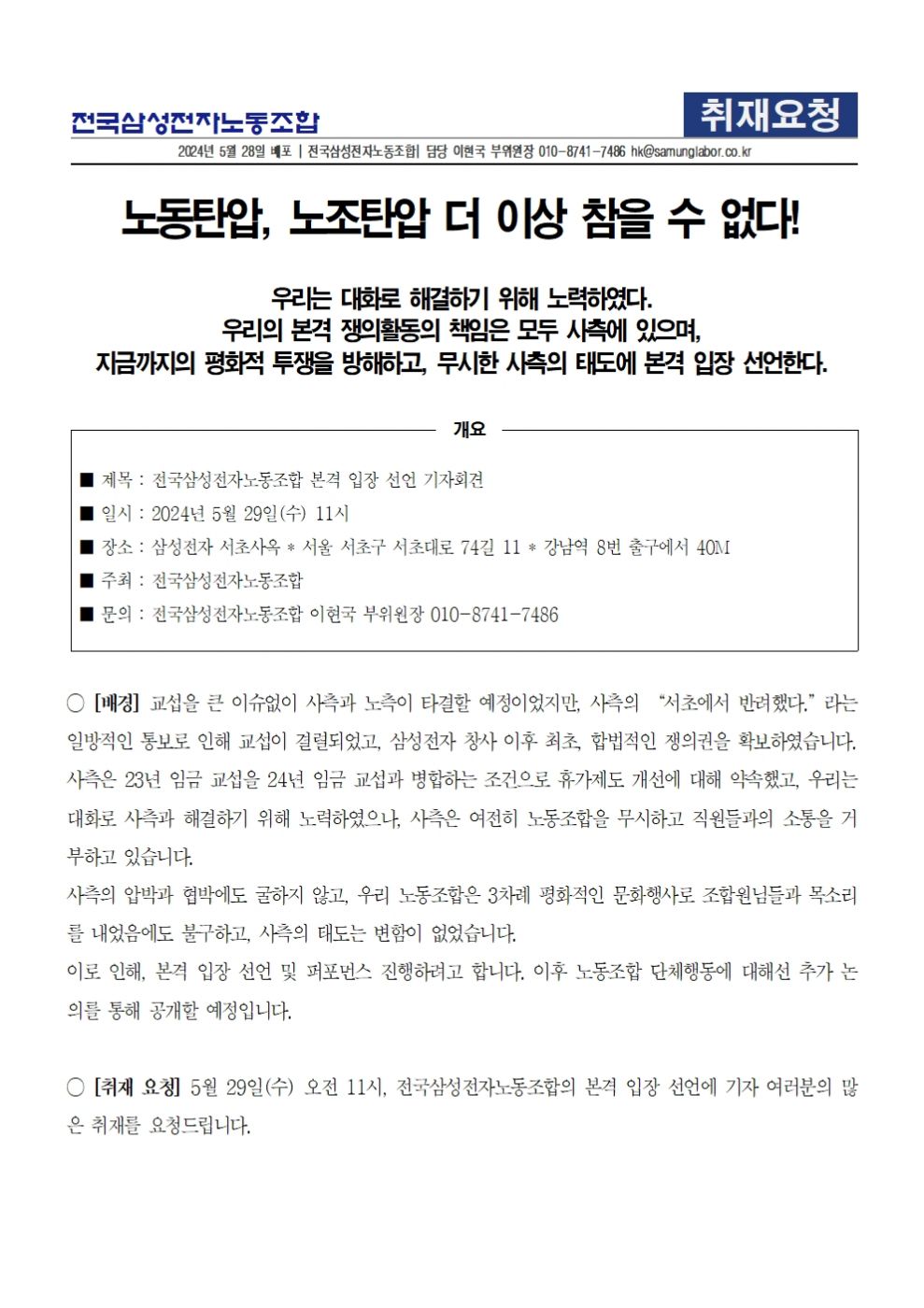 https://m.yna.co.kr/view/AKR20240529073901003 뉴진스 노래를 빌리자면, '파업은 없어~' 하던 삼성이었는데, 과연? 다른 기업과 좀 달라서, 모든 조합원이 파업하는 방식이 쉽지 않을 것도 같은데, 어떻게 될지 궁금합니다. 전국삼성전자노동조합은 조합원 수 2만 8천여 명의 삼성전자 사내 최대 노조입니다. https://samsunglabor.co.kr/ https://www.youtube.com/watch?v=hSgsI283VbQ 1
