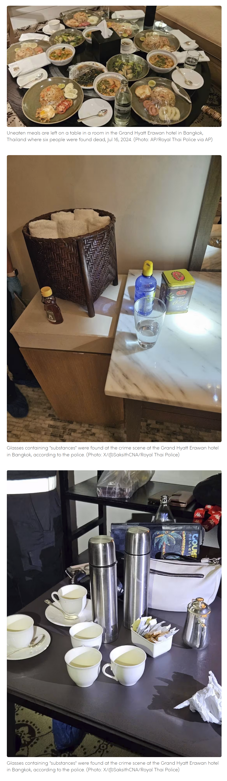 https://www.yna.co.kr/view/AKR20240717080952076 *종합2보로 수정했습니다. 태국 방콕 시내의 그랜드 하얏트 호텔에서 독살 사건이 발생했습니다. 숨진 남자 세 명, 여성 세 명(37~56세) 모두 베트남인인데, 이 중 두 명은 미국 국적도 가지고 있다고 합니다. 외상 흔적도 없고, 물잔과 찻잔에서 독극물(아마도 청산가리? - 현지 매체)이 발견되었다고 합니다. 이례적인 사건이고, 관광이 중요한 태국이다 보니 총리까지 현장을 찾았습니다. 룸서비스 음식들은 거의 건드리지도 못한 것 같습니다. (래핑 된 채로 있는 음식도 있음) 식전에 차나 물을 마시고 사망한 것 같습니다. 7층 4개 객실은 월요일에, 5층 객실 하나는 화요일에 체크아웃 예정이었는데, 시신들은 5층 객실에서 화요일 오후에 발견되었습니다. 짐도 다 싼 상태였고, 경찰 추정 사망한 지 24시간이 지나서 발견된 것으로 보아 월요일 체크아웃 전에 식사하기 위해 모인 자리에서 일이 벌어진 것 같습니다. 현장에 없는 사람 하나를 유력한 용의자로 보고 있는 것 같습니다. ----- 현장에 없던 사람은 지난 10일 출국해서 용의선상에서 제외되었고, 사망한 여섯 명 중 한 명이 나머지 사람들을 독살하고 본인도 음독 사망한 것으로 경찰에서 보고 있습니다. 채무가 원인인 것 같다고 합니다. 1