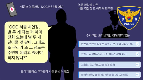 ""외압 의혹을 받은 조 경무관은 당시 인사혁신처 중앙징계위원회에 넘겨졌지만, 인사혁신처는 '불문'을 결정하고 징계하지 않았다. 조 경무관은 최근 논란이 불거진 직후 휴대전화를 바꾼 것으로 확인됐다.