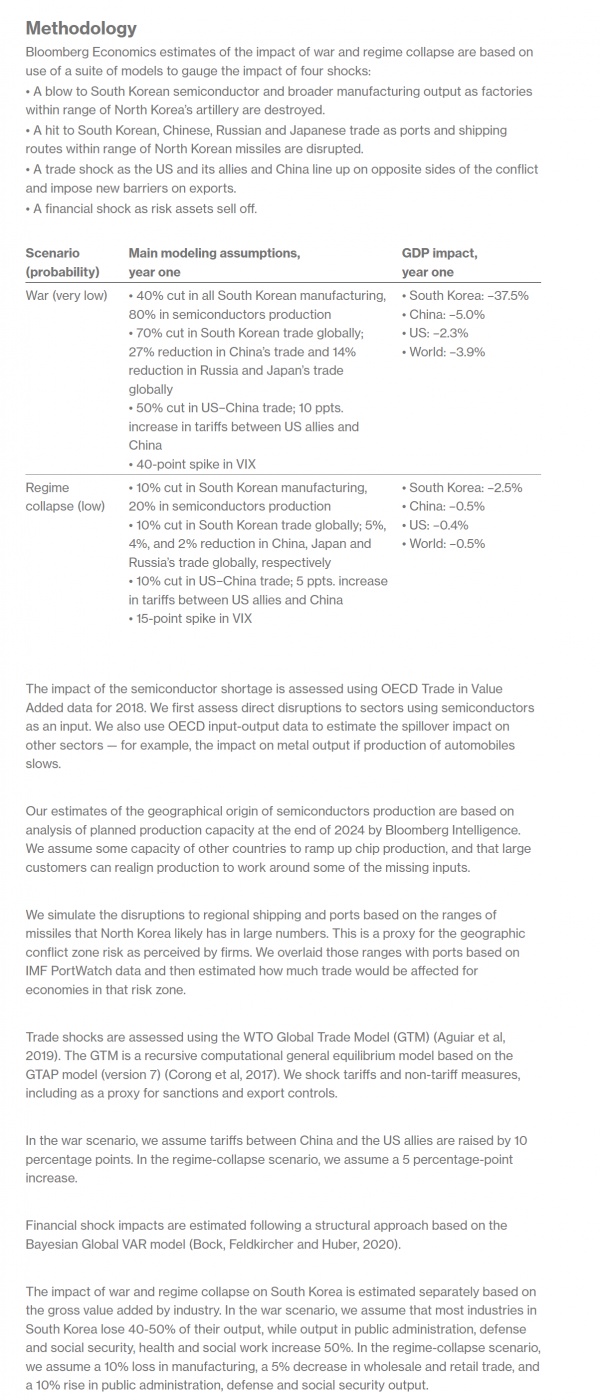 https://www.yna.co.kr/view/AKR20240729108400009 잊을만하면 한 번씩 계산하는 기사들이 나왔던 것 같습니다. 사람이 항상 일정 수준으로 이성적인 것은 아니죠. (유료) https://www.bloomberg.com/graphics/2024-korea-war-threatens-trillions-for-global-economy/?srnd=homepage-americas&sref=dMZmp8Ty 2