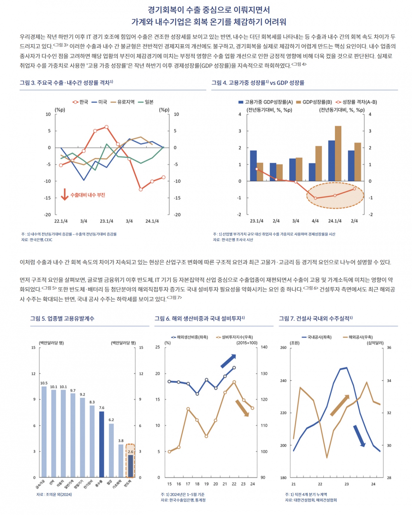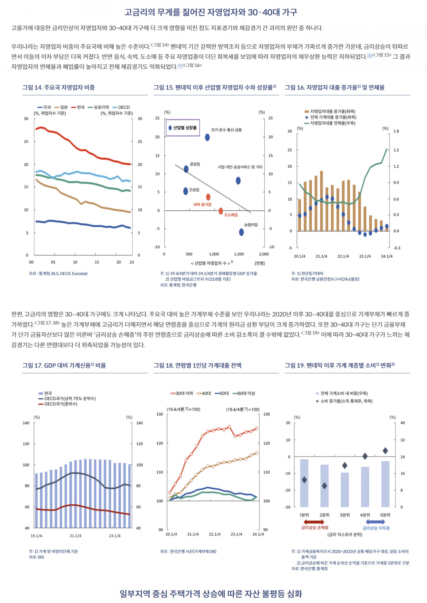 수출 중심, 해외 직접 투자 증가, 내수부진, 높은 체감 물가, 고금리도 자영업자와 30, 40대 가구 더 영향, 일부 지역 주택가격 상승으로 자산 불평등 심화.
