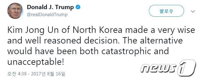 정치트럼프, 괌 포위사격 연기한 김정은에 "매우 현명하다" 1 |
