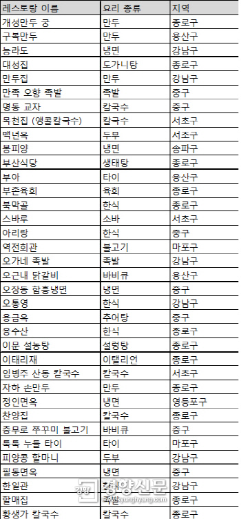 519 기타미슐랭 서울 ‘빕 그루망 식당’ 명단이 공개되었습니다. 10 Toby 16/11/01 4484 0