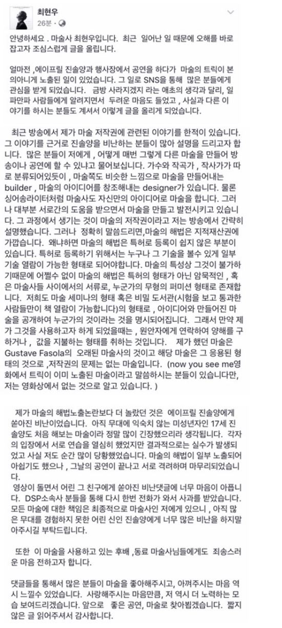 | Subject | '걸그룹 민폐' 영상에 마술사 최현우가 남긴 페북 |