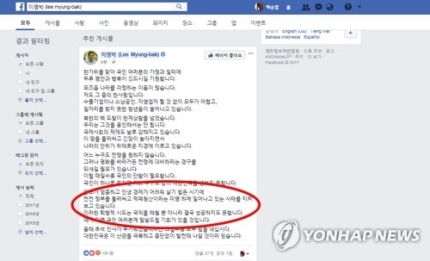 http://m.news.naver.com/hotissue/read.nhn?sid1=100&cid=1070398&iid=2382412&oid=001&aid=0009580594 페이스북에 글 올려…"안보 엄중한데 前前정부 둘러싸고 적폐청산 사태" "안보가 엄중하고 민생 경제가 어려워 살기 힘든 시기에 전전 정부를 둘러싸고 적폐청산이라는 미명 하에 일어나고 있는 사태를 지켜보고 있다" "이러한 퇴행적 시도는 국익을 해칠 뿐 아니라 결국 성공하지도 못한다" 적폐의 본원이 적폐청산에 대해서 말하고 있는 장면이다. 0