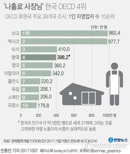 자영업의 나라 한국, '나홀로 사장님' 수 OECD 4위