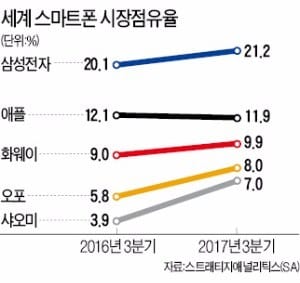 워클리에 따르면 세계 스마트폰 시장에서 나온 전체 이익 가운데 각 업체가 차지하는 비중은 2014년 애플 77%, 삼성 27%, 2015년 애플 90%, 삼성 16%, 2016년 애플 83%, 삼성 18%, 화웨이 5% 등이었다. 이들 3개사가 차지하는 이익 비중의 합계가 100%를 넘는 것은 다른 업체들이 스마트폰 사업에서 이익을 내지 못하고 오히려 손해를 보고 있기 때문이다.