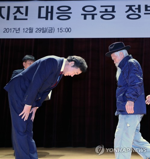 포항지진 대응 유공자에게 깍듯이 인사하는 국무총리