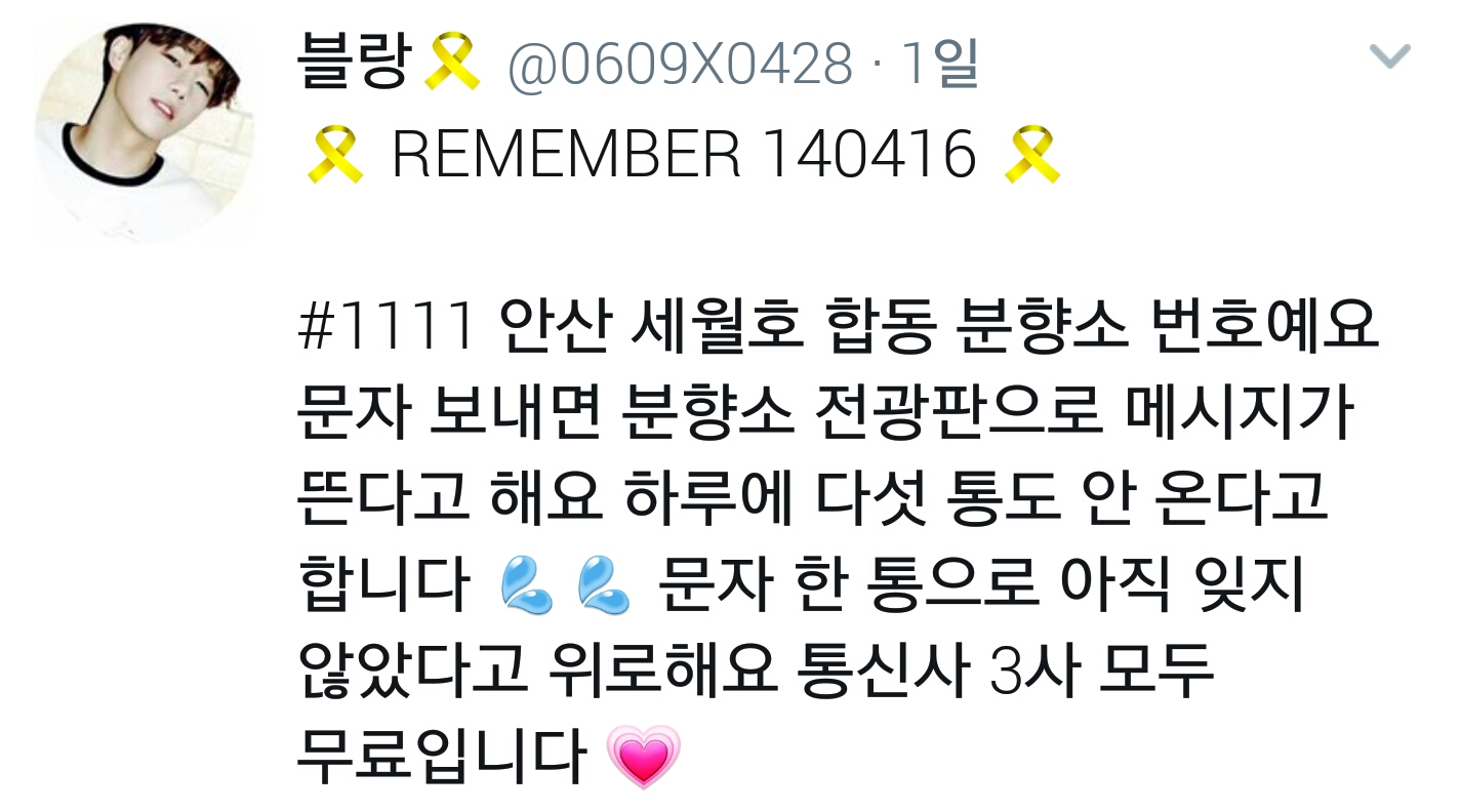 839 기타[2년전뉴스] <세월호참사> 합동분향소 새 추모메시지 번호 '#1111' 운영 6 Credit 16/11/21 3396 0