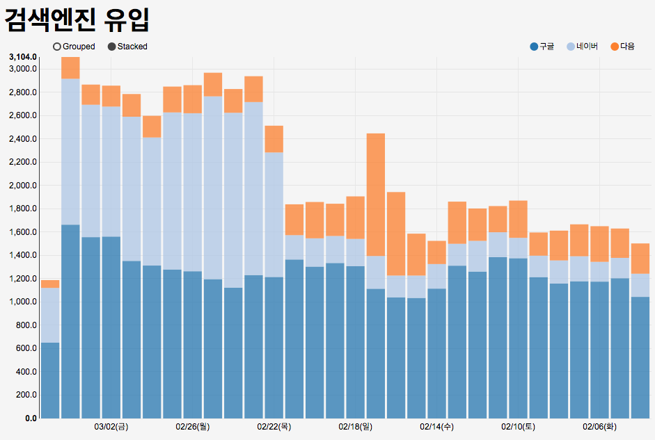 네이버가 다음보다 열배쯤은 트래픽이 많을거 같은데 오히려 보내주는 사람은 더 적은채로 거의 2년가까이를 보내왔는데 이제라도 회복이 되어서 다행이다 싶네요.